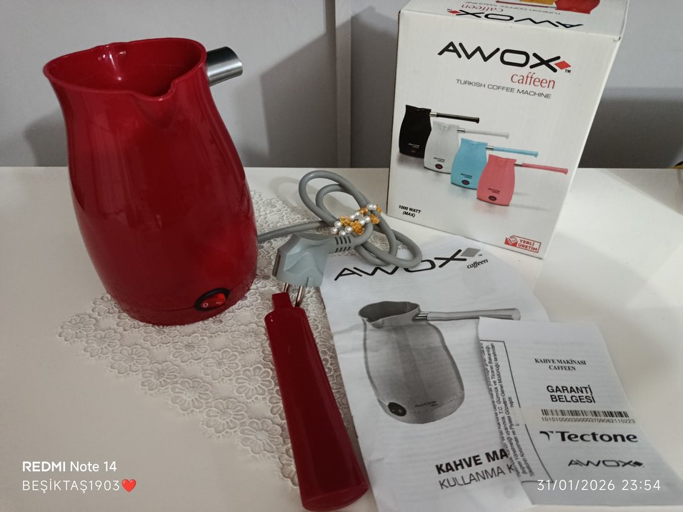 AWOX markalı kırmızı Türk kahvesi cezvesi, kullanımı kolay tasarım ve kullanım kılavuzu ile birlikte gelir. Geleneksel kahve hazırlamak için uygundur ☕. birkaç kez kullanıldı başka kahve makinam olduğu için bu satışta çok güzel köpürtüyor yanında küçük hediylerle gönderilecek garanti devam ediyor olması lazım