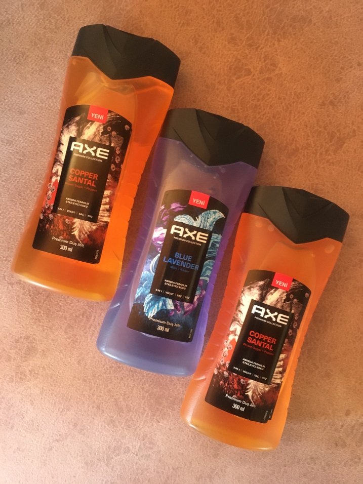 AXE duş jelleri 300 ml şişelerde, Copper Santal ve Blue Lavender kokularıyla. Ferahlatıcı ve canlandırıcı temizlik sağlar.