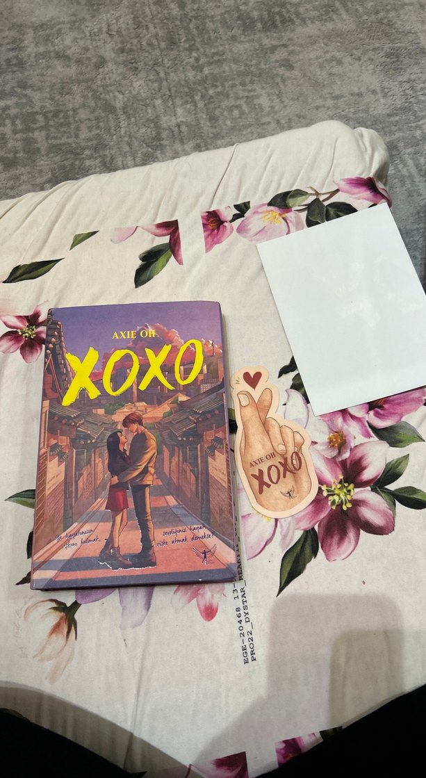 Axie Oh'un "XOXO" romanı, sokakta sarılan bir çiftin romantik kapak çizimi ve yazar adı ile el şekilli kart içerir. Sıfır