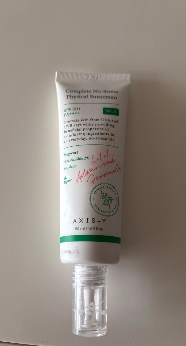 AXIS-Y Complete No-Stress fiziksel güneş koruyucu, SPF50+ koruma, %2 niasinamid ve oğul otu özleri içerir. UVA ve UVB ışınlarına karşı cildi korur ve besler. ☀️bir kez denendi. Neredeyse doludur.