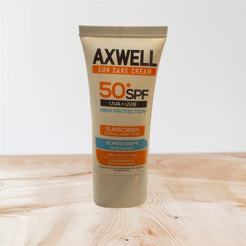 Axwell SPF 50+ yüksek koruma sağlayan güneş kremi. Yüz ve vücut için, suya dayanıklı ve makyaj altı baz etkili. ☀️