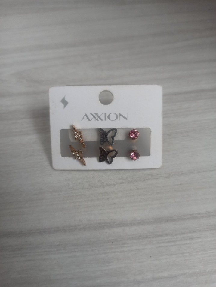 AXXION markalı set, kelebek ve mini taşlı kahverengi kısa uzunlukta payetli küpeler içerir, günlük minimalist stile uygun.