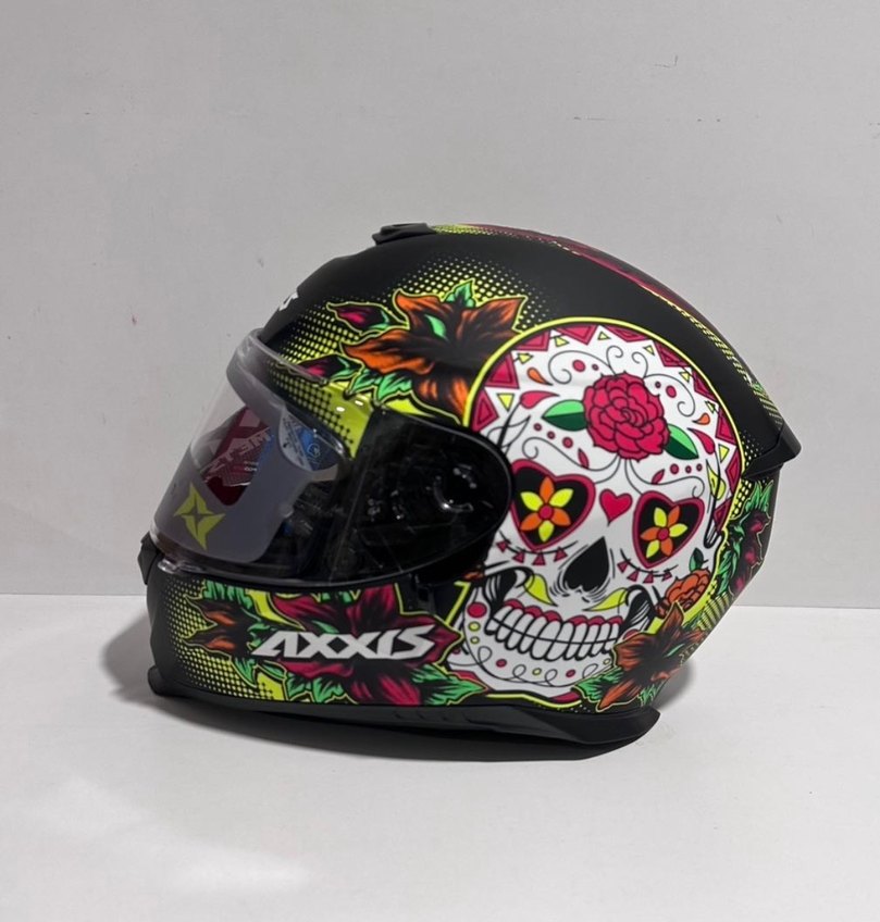 1 adet Axxis Eagle SV Mexican Skull A11 Matt Black Kapalı Motosiklet Kaskı. Sıfır ve etiketli üründür. XXL bedendir. XXL beden ölçüsü 63-64 cm'dir. ECE ve DOT güvenlik sertifikaları mevcuttur. Kendi kutusunda taşıma kılıfıyla gönderilmektedir. Dahili iç güneş vizörü vardır. Yaklaşık ağırlığı 1600 gramdır. #axxis #eagle #kask #fullface #mexican #kapalıkask #skull #siyah #matblack