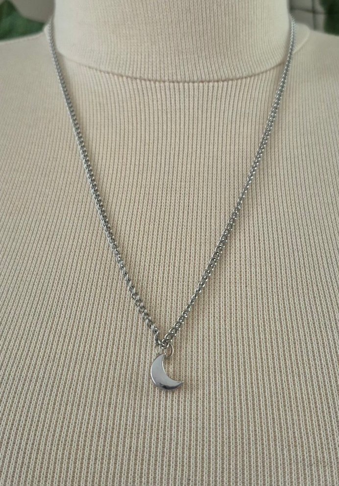 Zincir detaylı, küçük hilal figürlü gri minimalist kadın kolye. Günlük sokak stiline uygun midi uzunlukta.