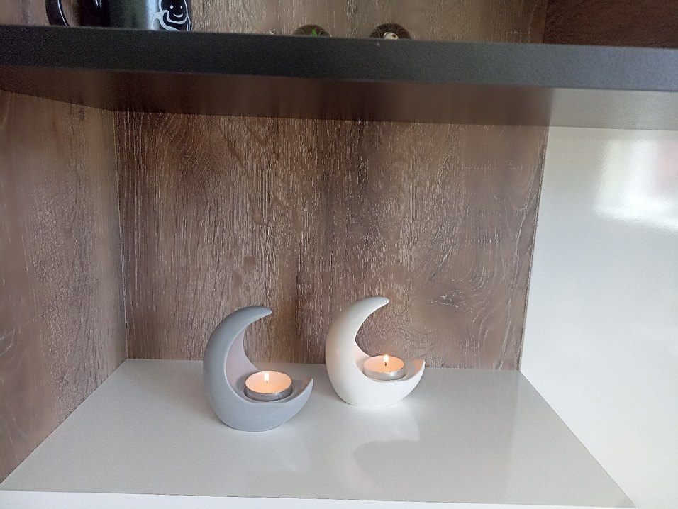 Gri ve beyaz renklerde, küçük mumlar için ay şeklinde iki adet mumluk seti. Sıcak bir atmosfer yaratır. ️