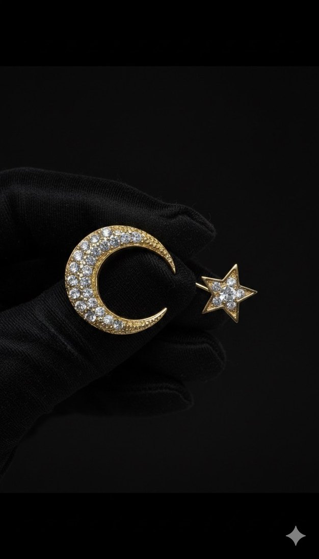 Ay ve yıldız tasarımlı, parlak payetlerle süslenmiş bros. SIFIR ÜRÜN