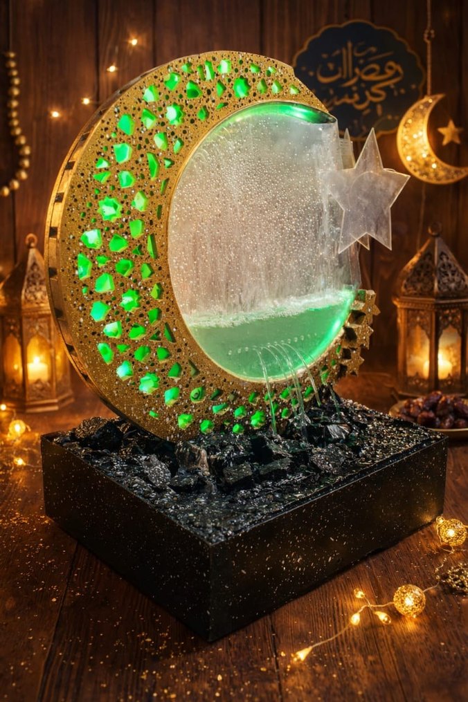 Yeşil ışıklandırmalı ay ve yıldız şeklinde dekoratif su çeşmesi, huzurlu bir atmosfer yaratır. hava güzel koku sağlar hava nemlendirir ramazan özel fotoğraftaki ile tıpatıp aynı saten oradaki fotoğraf ben çektim bu efsane kendim yapıyorum