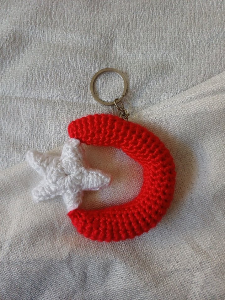 Renkli, örgü kırmızı halka ve beyaz yıldız detaylı, sade ve bohem tarzda anahtarlık. Rahat ve şık bir aksesuar.