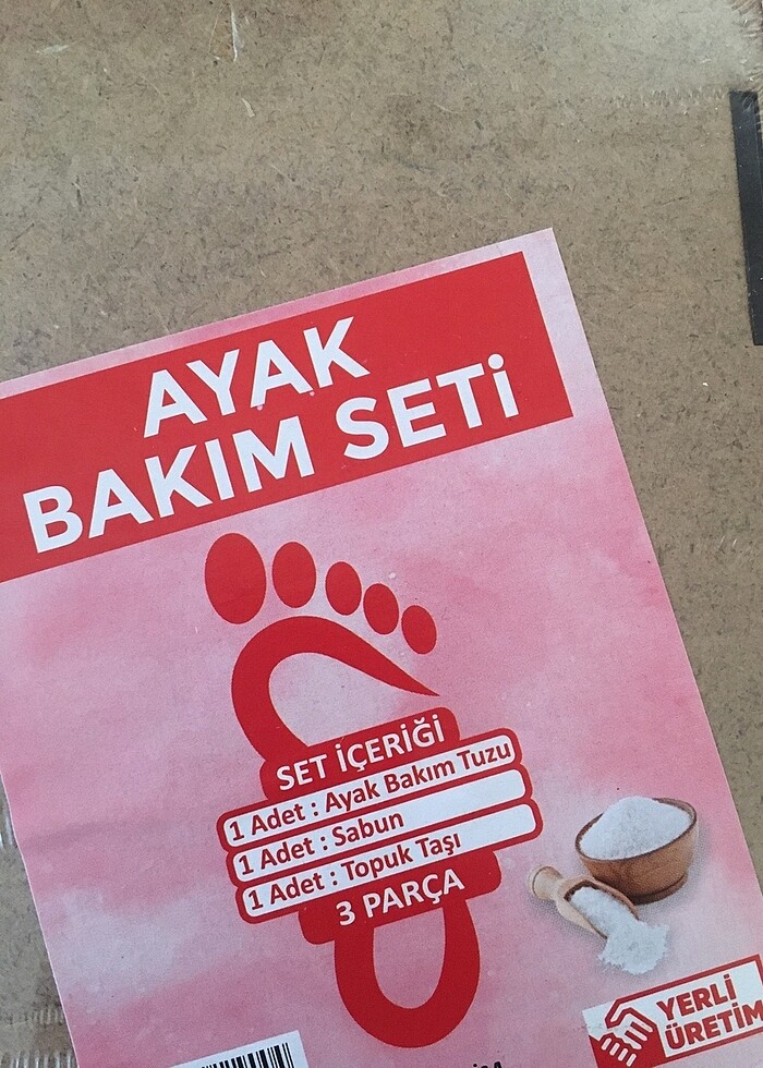 Ambalajın içinde ayak bakım ve banyo tuzu, doğal taş ayak törpüsü ve doğal lavanta sabunu var.