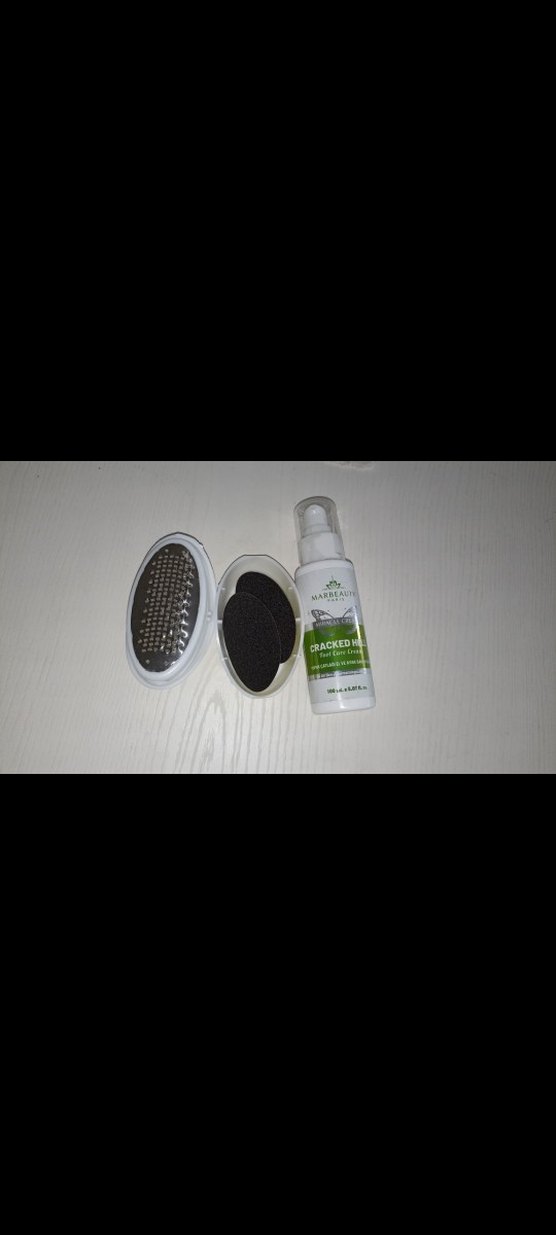 Kırık topuk kremi ve metal törpü ile sünger içeren ayak bakım seti. Sert topuklar için uygun.