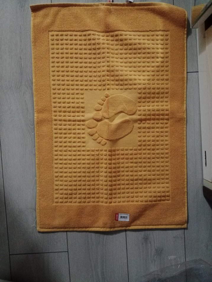 Ayak izli desenli sarı banyo havlusu, dokulu yüzeye ve klasik tasarıma sahiptir. Yumuşak ve emici yapıda. Hiç kullanılmadı. Ceyizimden