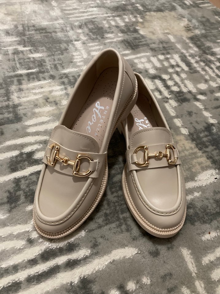 Bej/nude rengi ENTELLA STORE MARKASI Hiç giyilmedi, sıfır Bej deri kadın loafer, blok topuklu ve altın tokalı detaylara sahip