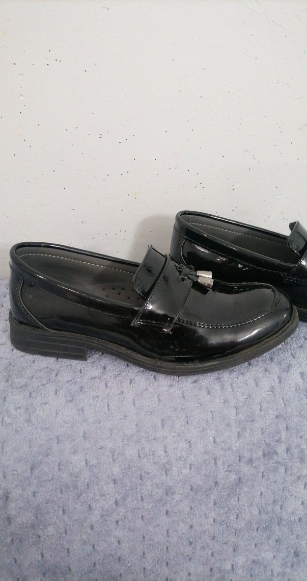 Parlak siyah renkte, kemerli detaylı erkek çocuk loafer ayakkabılar. Kauçuk malzemeden üretilmiş olup, desensiz ve gotik tarzda klasik bir görünüme sahiptir.