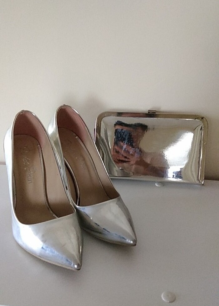 Ayyakbı ve çanta kombin gönderilecektir. Ayakkabı numarası 37. Platin gümüş rengi. Çantanın bir yüzünde dolapta durmaktan sarı benekler oluşmuş dekorunu ya da görüntüyü bozmuyor. Bunun dışında bir deformasyonu yoktur