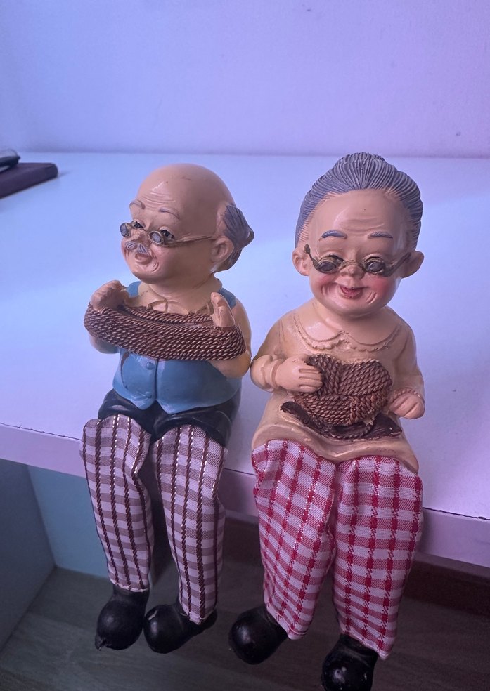Renkli, gözlüklü yaşlı çift figürinleri, desenli pantolonlu ve ellerinde örme eşyalar tutan figürler.