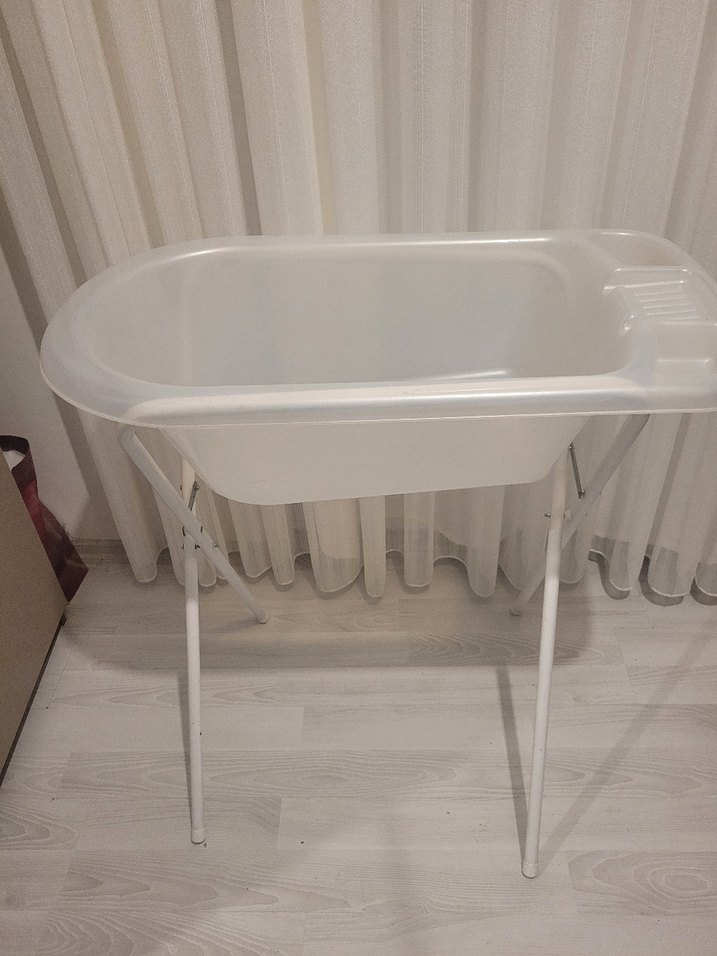Geniş hazneli ve katlanabilir ayaklı, beyaz bebek banyosu.