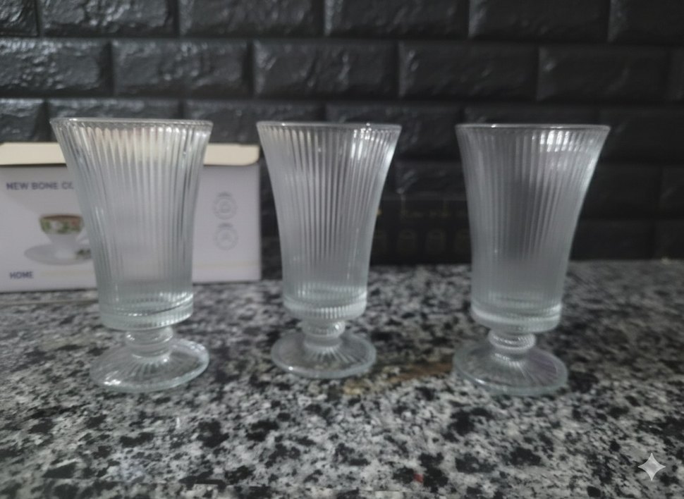 Dikey çizgili dokusu ve ayaklı tabanı olan beyaz cam bardak seti.6 adet