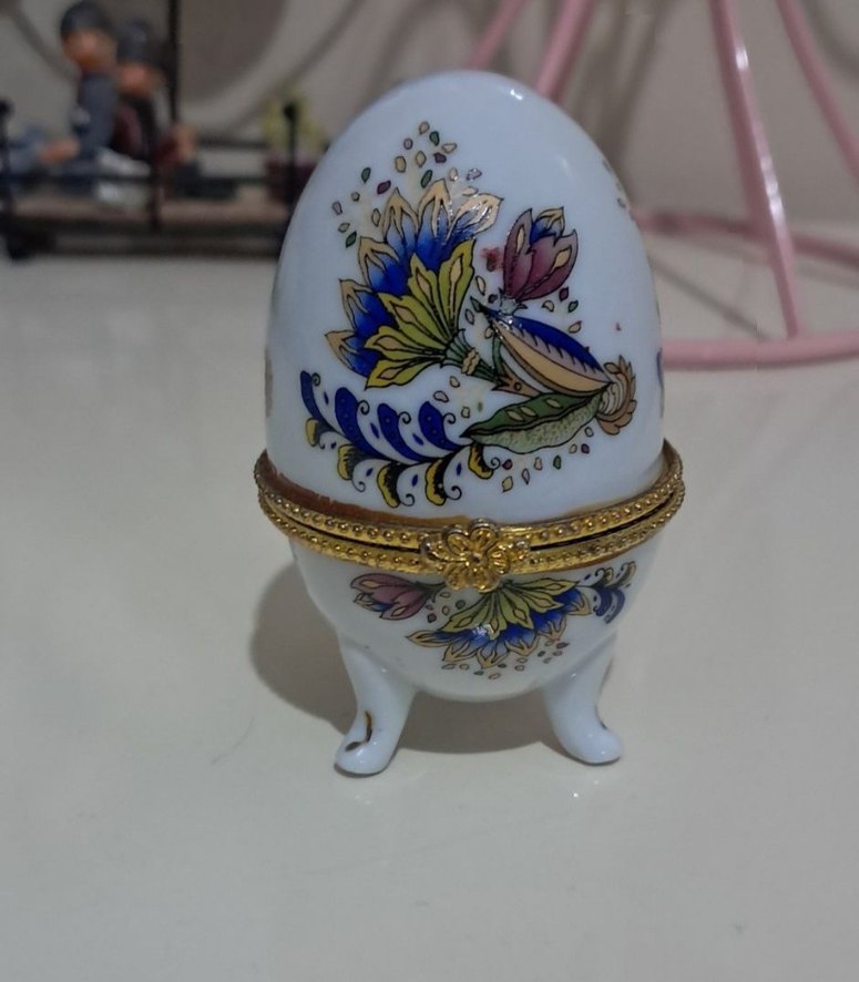 Ayaklı beyaz porselen yumurta biblo, renkli çiçek desenleri ve altın renkli süslemeli menteşeye sahiptir.