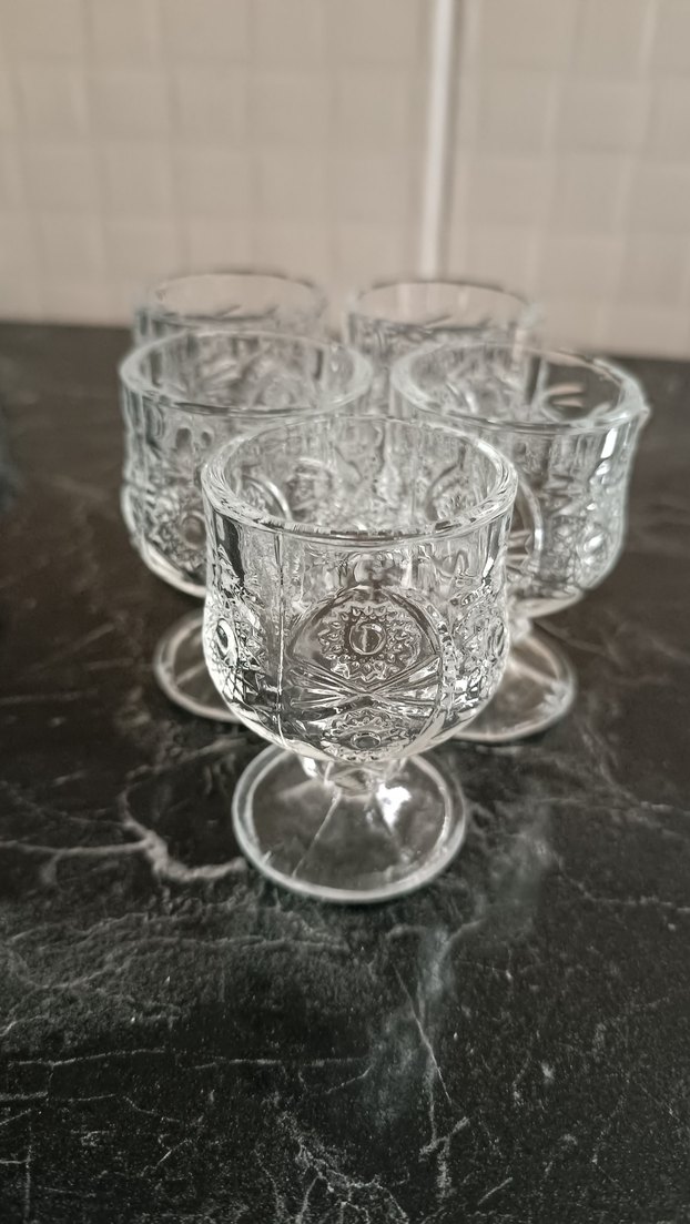 Ayaklı, detaylı desenli şeffaf cam bardak seti. Zarif ve vintage tarzda içecek sunumları için uygundur. Hediye geldi, ihtiyaç fazlası olduğundan satılmaktadır. 5 tanedir.