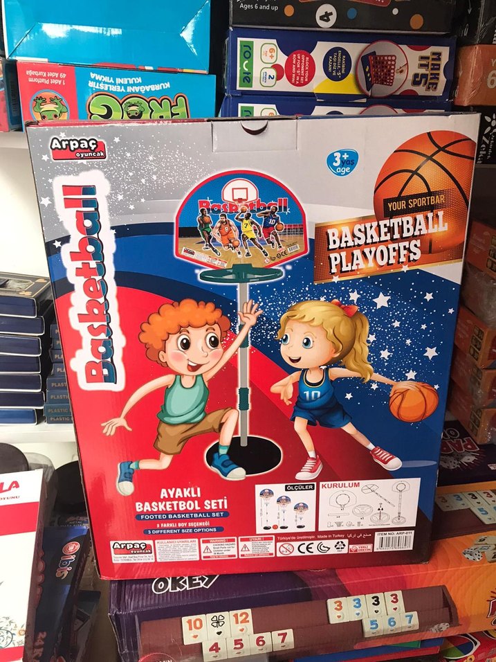 3 yaş ve üzeri çocuklar için ayaklı, renkli basketbol seti. Oyunlu basketbol görselleri ve kolay kurulum talimatları içerir.