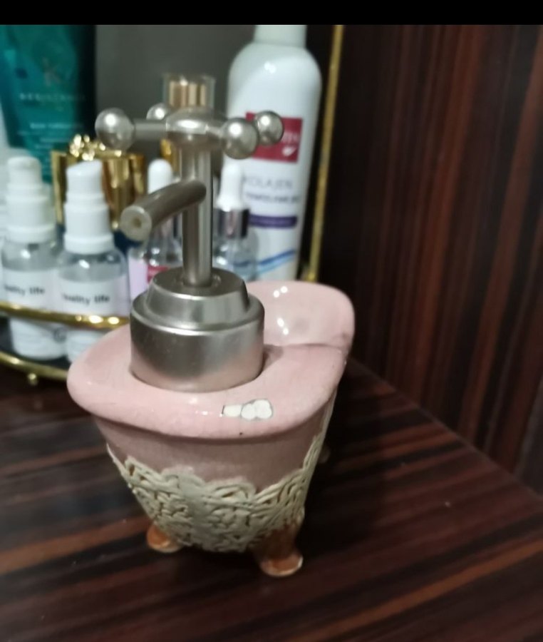 Gümüş pompalı, ayaklı ve dokulu detaylı pembe seramik sıvı sabunluk.