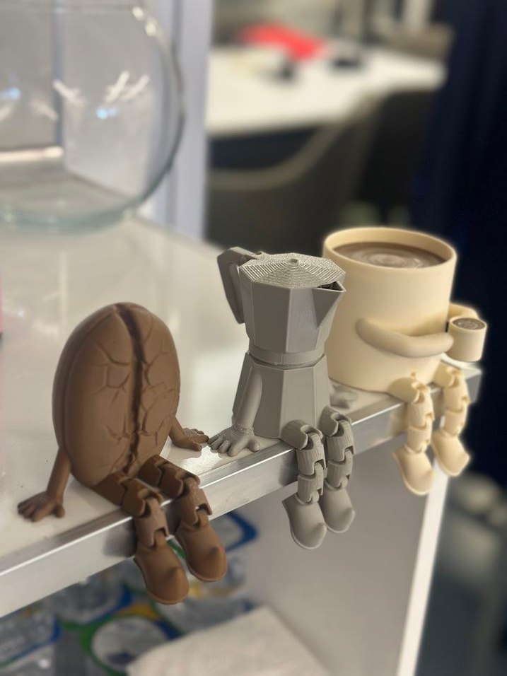 Kahve temalı bej ve gri renklerde üç figürden oluşan set, hareketli bacaklarıyla kenarlara oturabilir. ☕
