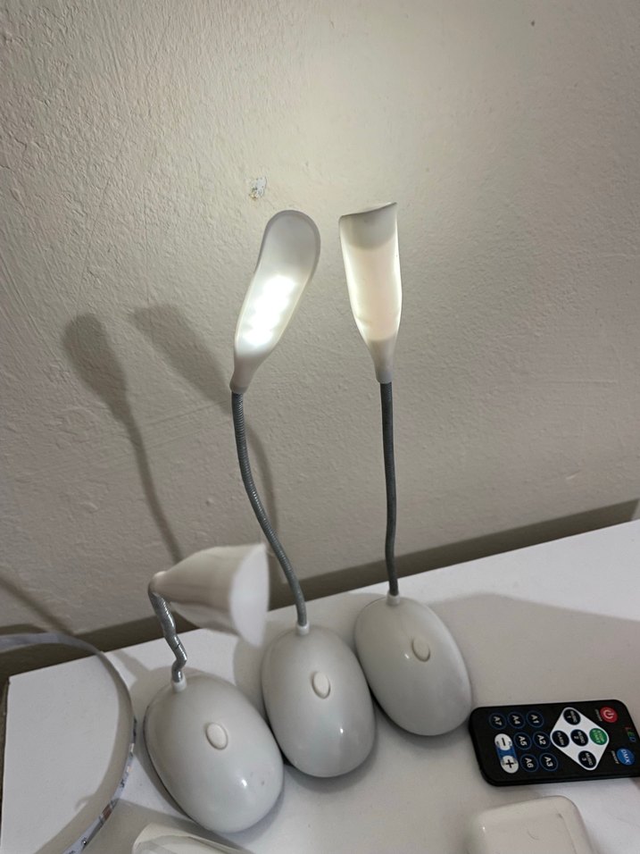 Esnek boyunlu, oval tabanlı ayarlanabilir beyaz masa lambaları. Her lambada tabanda güç düğmesi bulunur.