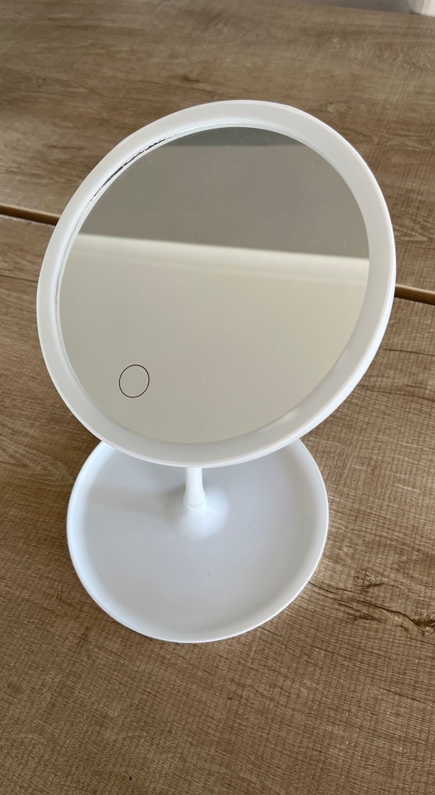 Dokunmatik sensörlü aydınlatmalı, ayarlanabilir yuvarlak çerçeveli beyaz masaüstü makyaj aynasıdır. Sağlam tabanı ile kullanışlıdır.