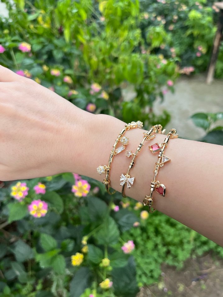 Renkli boncuklar ve çiçek ile fiyonk detayları taşıyan altın renkli bileklikler. Günlük kullanıma uygun, şık aksesuarlar.
