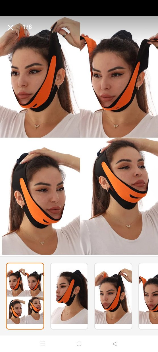 Yumuşak, esnek kumaştan ayarlanabilir çene şekillendirici maske, çene hattını destekleyip şekillendirir. Rahat kullanım sağlar.