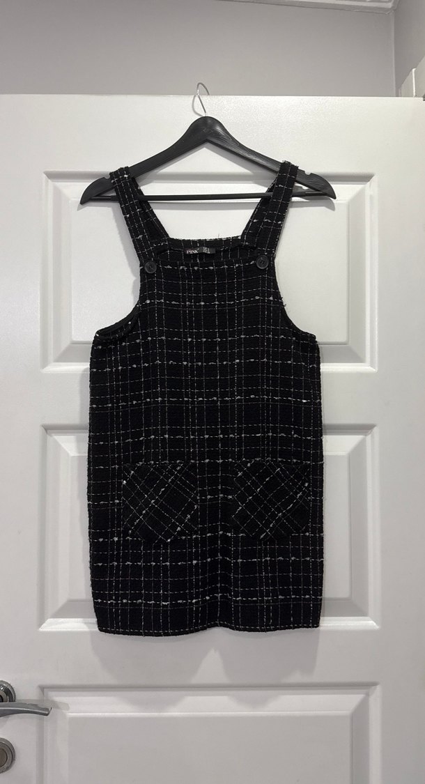 Ayarlanabilir düğmeli Siyah kareli midi elbise, örgü görünümlü sentetik kumaştan, regular fit ve askılıdır. Ön cepleriyle günlük sokak stili için uygundur.