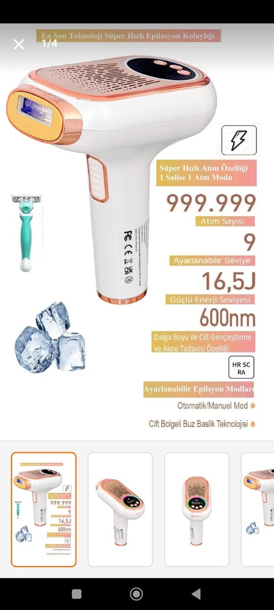 Beyaz lazer epilasyon cihazı, ayarlanabilir mod ve seviyelerle. 999.999 atım, 16.5J enerji, 600nm dalga boyu ile cilt gençleştirme ve çift bölgeli buz baslık teknolojisi sunar. Otomatik/manuel mod ve süper hızlı atım özelliği bulunur. deneme amaçlı kullanıldı❄️