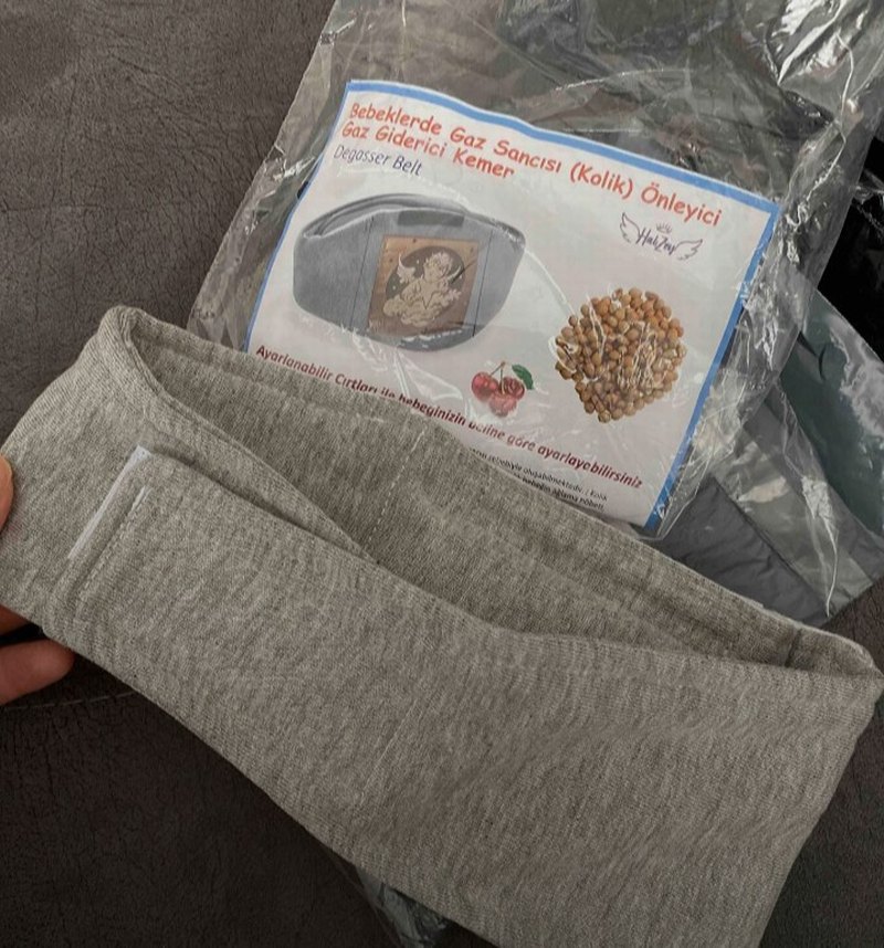 Kolik ve gaz sancısını önleyen, ayarlanabilir gri bebek kemeri, yumuşak ve rahat kumaştan üretilmiştir.