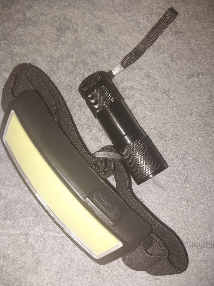 Ayarlanabilir bantlı siyah kafa lambası ve bilek kayışlı kompakt el feneri seti, pratik aydınlatma sağlar.