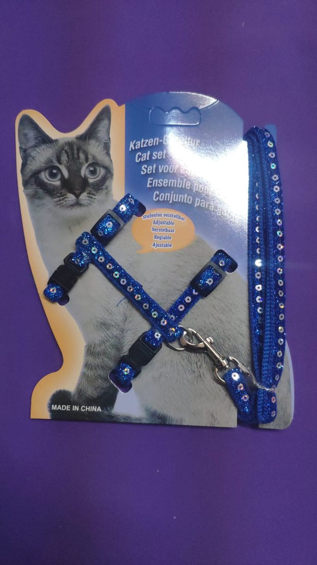 Ayarlanabilir mavi renkli kedi tasması ve gezdirme seti, küçük süslemelerle renkli bir tasarıma sahiptir. Çin'de üretilmiştir.