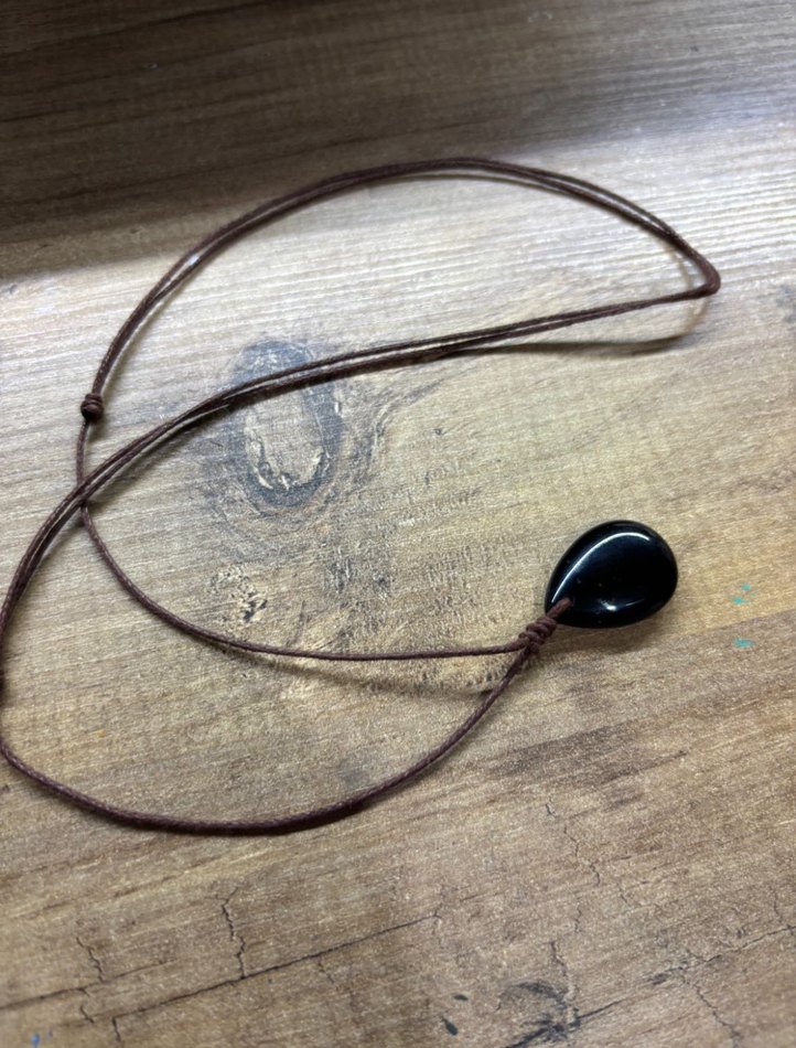 Bu uzun siyah kolye, ince ip üzerinde damla şeklinde obsidyen taşlı sade bir tasarıma sahip, minimalist bohem tarzını yansıtıyor.