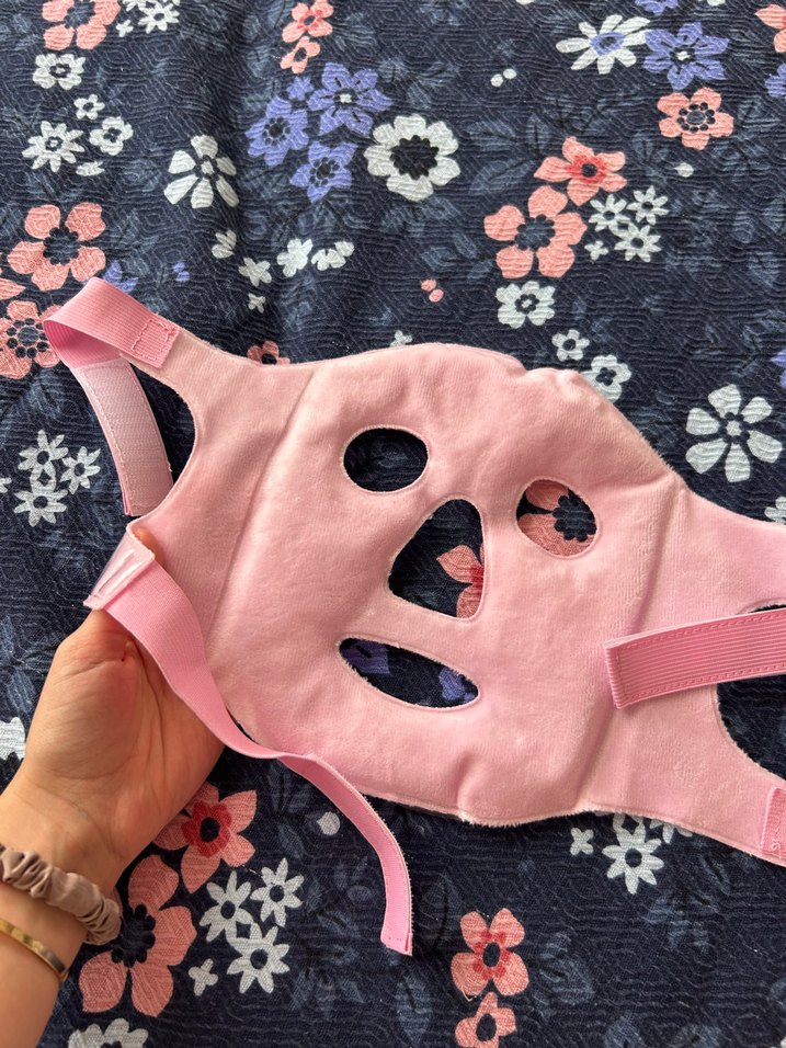 Göz, burun ve ağız için ayarlanabilir pembe yüz maskesi, rahat kullanım sağlar. Hiç kullanmadım kenarda duruyordu. tek kullanımlık değildir. Dolapta bekletebilirsiniz.
