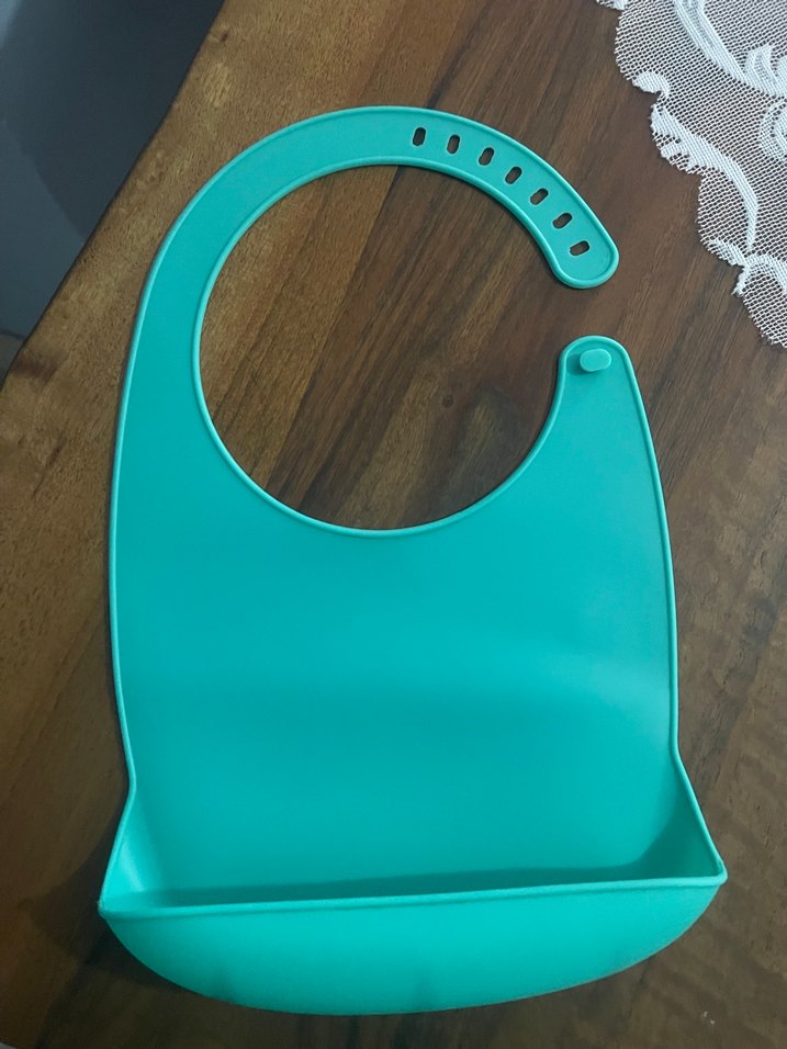 Ayarlanabilir boyun askısı ve döküntüleri yakalayan derin cep içeren, yumuşak ve esnek malzemeden turkuaz bebek önlüğü.