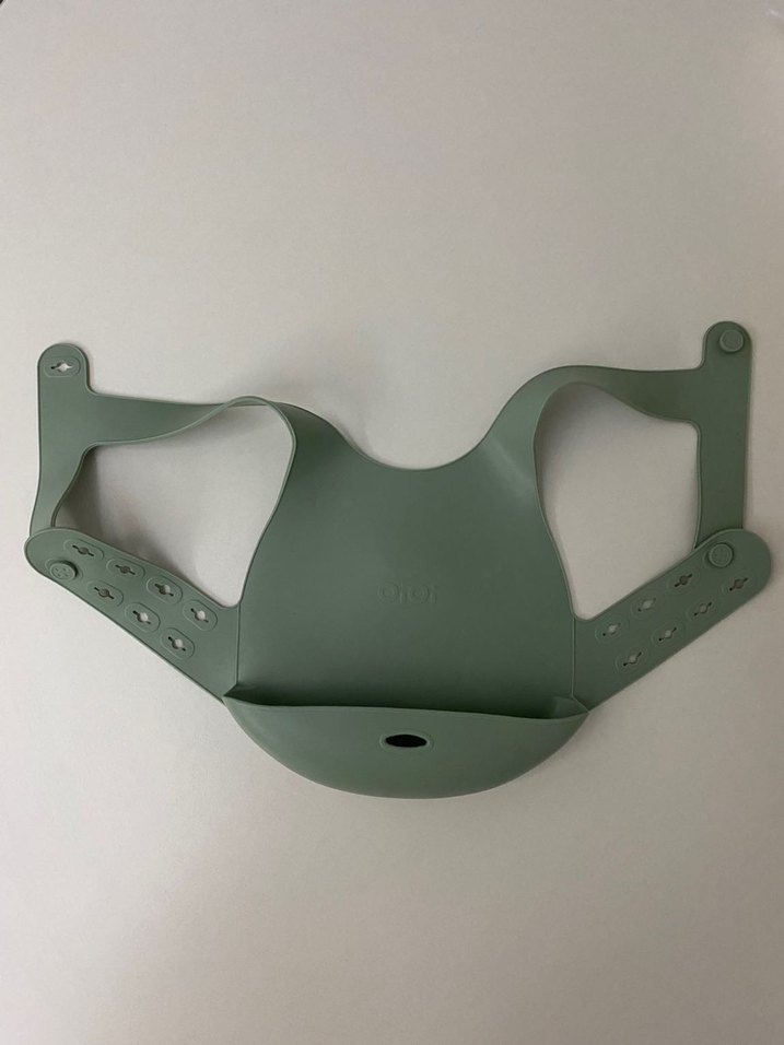 Ayarlanabilir tasarıma sahip yeşil bebek önlüğü, dökülenleri yakayan geniş cep ve kolay temizlenen esnek malzeme içerir. Herhangi bir yırtılma defo yok. Fotoğrafta su lekesi var. Kalıcı lekeler değil.
