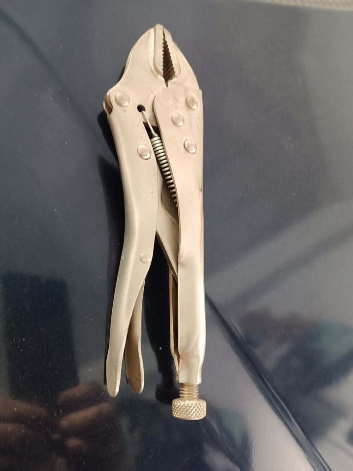 Ayarlanabilir vidalı, sağlam tutuşlu gri beyaz kilitli pense. Metalden yapılmış ve yay mekanizmalı. ️