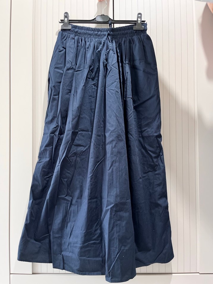 Lacivert renk, keten kumaştan, bol kesim ve drapeli uzun kadın eteği, minimalist bohem tarzı için uygundur. 1 defa kullanıldı tertemiz sıfır ayarında aynı renkten eteğim olduğu için satıyorum standart beden