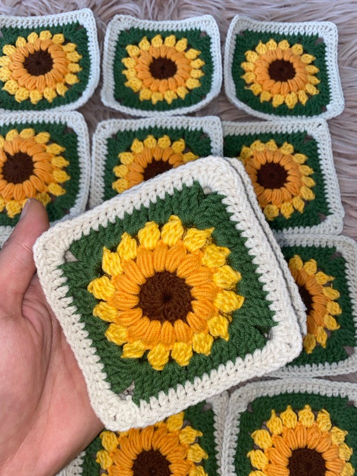 Bohem tarzda, yeşil, sarı, kahverengi ve beyaz iplerle örülmüş ayçiçeği desenli el örgüsü kare motifler.