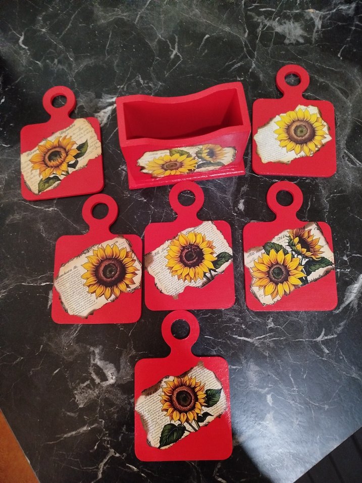 Kırmızı ahşap stand ve altı adet ayçiçeği desenli bohem tarz el işçiliği bardak altlığı seti. Spirituel Danışman olduğum için sembolleri kullanıyorum.Bu bardak altlıklarını Kullanıldığı haneye bolluk bereket getirmesi için kodladım. sipariş üstüne yapıyorum, 3 4 günde yaparım. tümüyle kendi el emeğimdir. Harika bir hediye olur. #bardakaltlığı #ahşapbardakaltlığı #ayçiçeği #bollukbereket #hediye #hediyelikbardakaltlığı