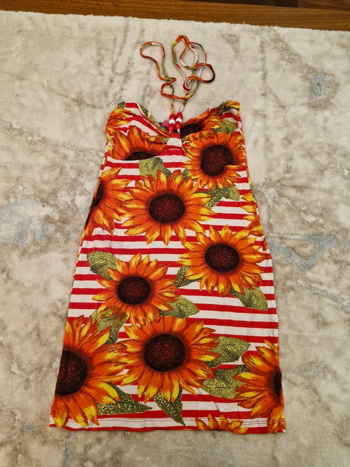 Renkli ayçiçeği ve çizgili desene sahip, ayarlanabilir boyun bağcıkları bulunan elbise