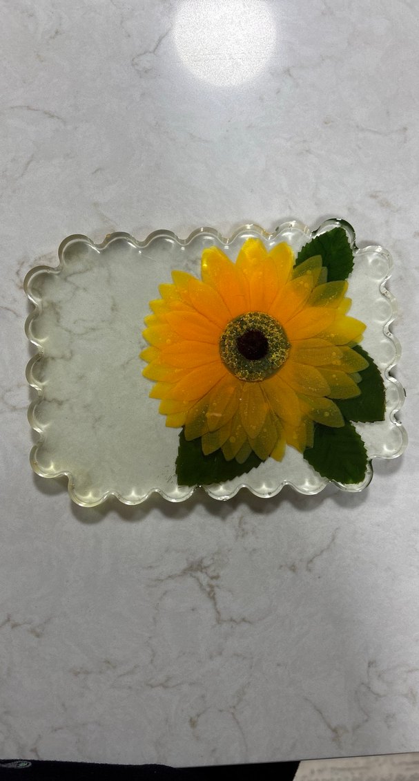 Ayçiçeği deseni ve dalgalı kenarları olan şeffaf sunumluk tepsi içinde parlak sarı çiçek ve yeşil yapraklar bulunur.