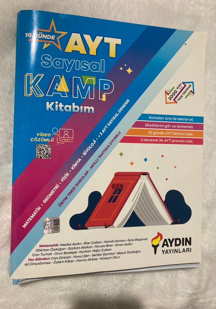 AYDIN Yayınları 10 Günde AYT Sayısal Kamp Kitabı, video çözümlü ve matematik, geometri, fizik, kimya, biyoloji konularını kapsar. 60+ soru ve 2 deneme içerir. Sıfır kitap 2022 başım