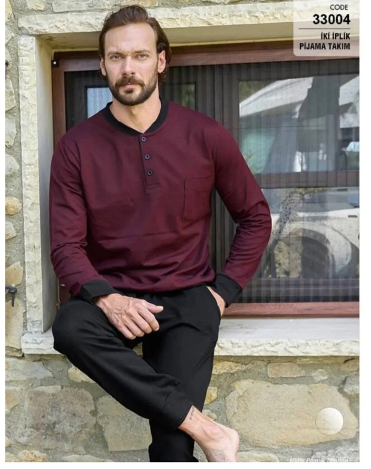 Bordo uzun kollu yuvarlak yaka üst ve siyah pantolonlu erkek pijama takımı. Rahat kesimi ve sade tasarımıyla günlük kullanıma uygundur.