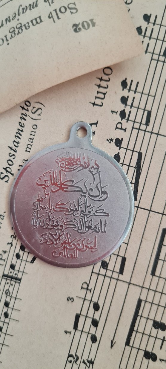 Üzerinde Arapça hat yazısıyla Ayet-el Kürsi yer alan, dua ve korunma amacıyla taşınan klasik bir madalyon. Yuvarlak formu ve sıkıştırılmış hat kompozisyonu, 20. yüzyılın başlarında yaygın olarak kullanılan muska ve kolye ucu örneklerini hatırlatıyor. Ayet-el Kürsi, İslam geleneğinde en güçlü koruyucu ayetlerden biri olarak kabul edilir; bu nedenle bu tür madalyonlar genellikle kişisel bir eşlikçi olarak taşınmıştır. Sade metal yüzeyi ve zamana bağlı izleriyle, inançla gündelik hayatın kesiştiği sessiz ama güçlü bir obje.