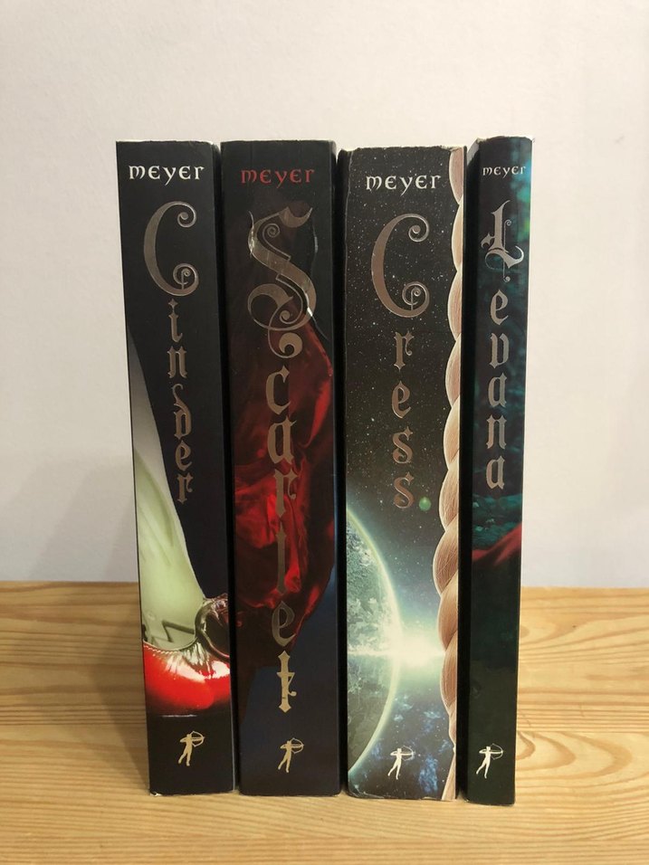 Meyer'in 'Cinder', 'Scarlet', 'Cress' ve 'Levana' adlı dört romandan oluşan fantastik roman seti. Levana biraz eskidi, kenarlarında yıpranma var.