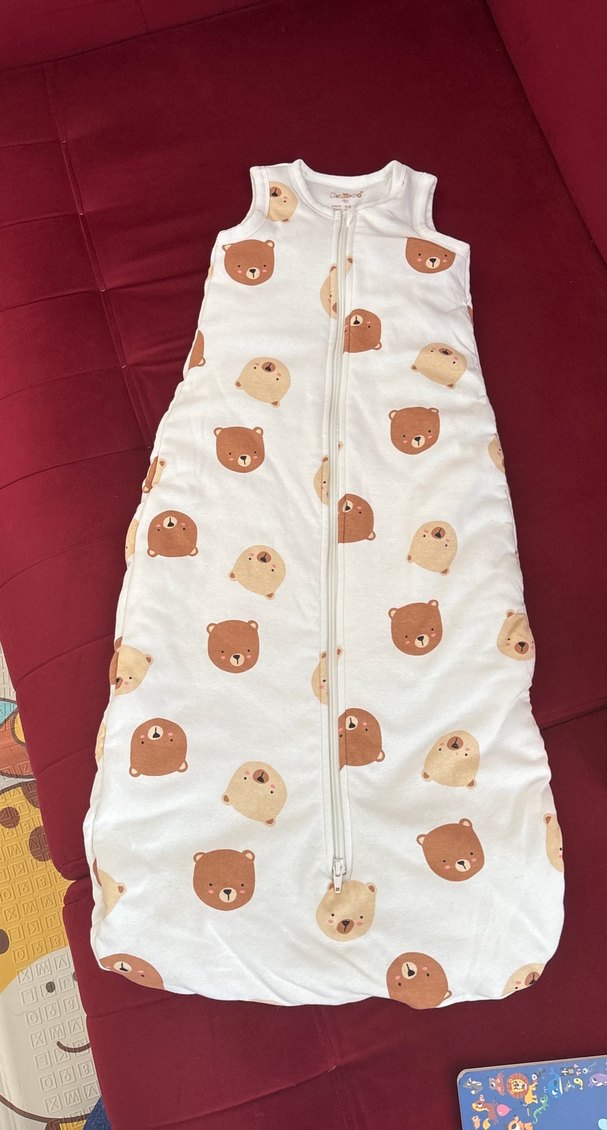 Pastel kahverengi ayı desenli, yumuşak ve sıcak bebek uyku tulumu. Kolsuz ve ön fermuarlı tasarım içerir. Fermuar tek yön ve kapatıldıgında tulumun alt tarafında kalmaktadır. Yurtdışından alınmıştır.